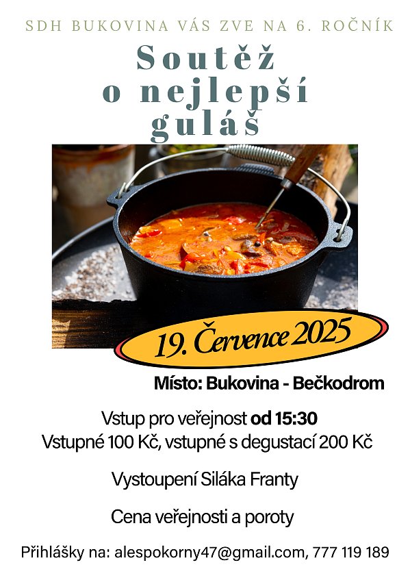 Sbor dobrovolných hasičů Bukovina Vás zve na 6. ročník Soutěže o nejlepší guláš, která proběhne v sobotu dne 19. července na Bečkodromu. Začátek pro veřejnost bude od 15.30 hodin, základní vstupné 100 Kč nebo 200 Kč s ochutnávkou gulášů. Těšíme se na setkání s Vámi!